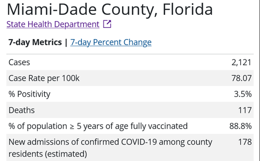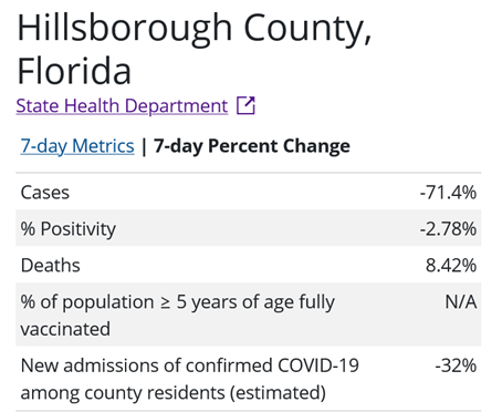 Here are a few of the FL Dept of Health county positivity rates. Hillsborough County’s fell 41%, from 9.7% to 4.0%. The state average also dropped by 41%, from 5.6% to 3.3%.