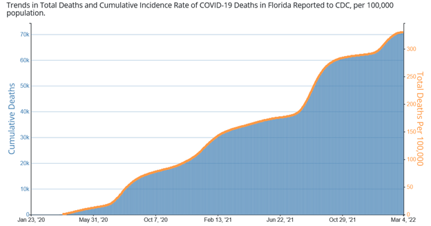 - As of March 3, 2022, FL has claimed 70,997 cumulative Covid deaths.