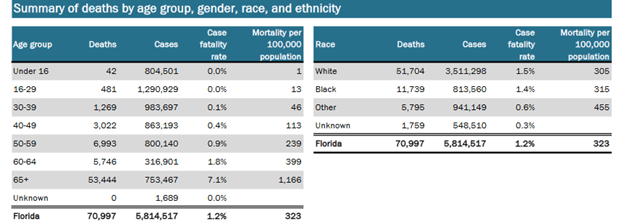 - FL has 9.2% of US deaths when vaccinations were available to all over 15 (6.6% US population).