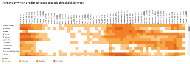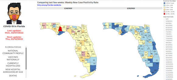 Dr. Jason Salemi‘s county-level data is quite helpful. Note that the date reflects the beginning of the week. It indicates that Hillsborough County’s case rate fell 72%, from 200/100,000 people to 56/100,000 during February 25–March 3, 2022. On his site, you can click on the maps for detailed information on each county: