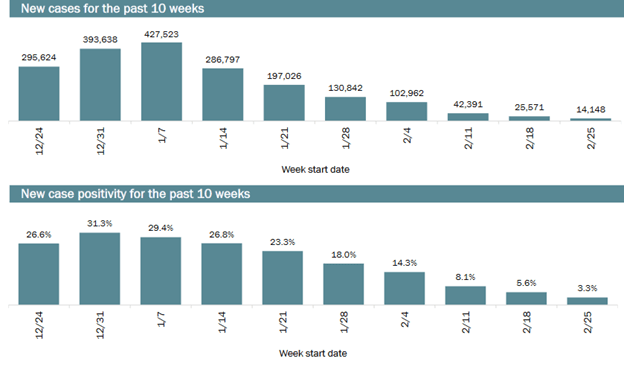 A new case positivity rate of 3.3% means there is enough testing to capture mild and asymptomatic cases. It fell 41% in the past week: