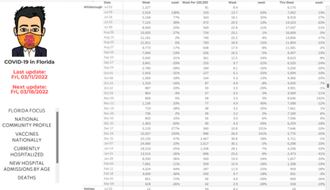 - Hillsborough County had 103 deaths, an 8% weekly increase.