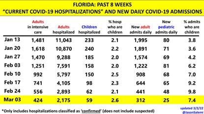 - On March 3rd, there were 1.46 new admissions/100,000 Floridians; 2.17 the week before.