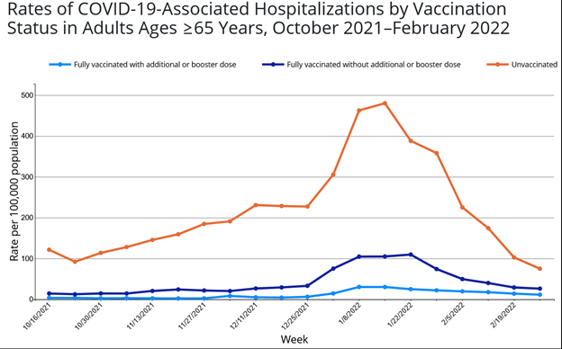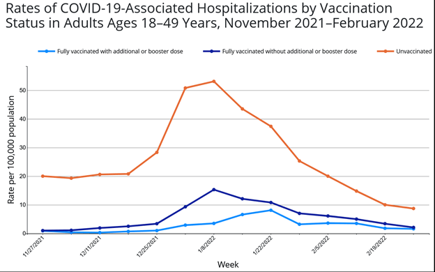 On March 31, 2022, hospitalizations had declined for every adult age group compared to March 24th, ranging from 5% for ages for those 70+ to 33% for ages 30–39.