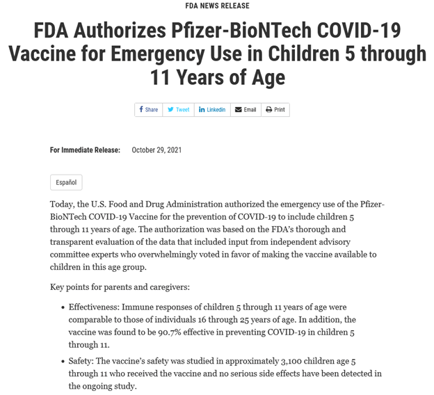 - The FL Dept of Heath website claims the FDA recommends vaccination for those 12+, not 5+.