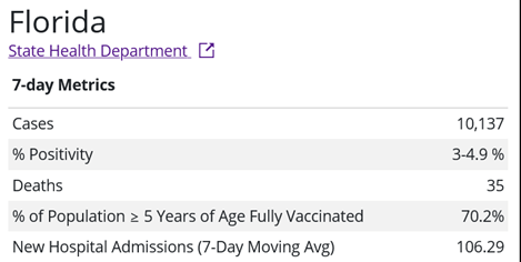 - Florida claimed a 74% vaccination rate. This includes “vaccine tourists.”