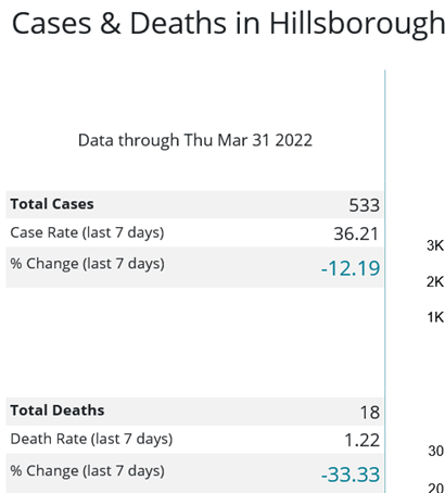 - Hillsborough County had 18 deaths, a 33% weekly decrease.