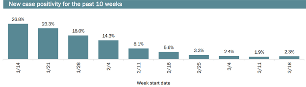- Covid cases and the positivity rate continued to increase after dropping to their lowest levels since June 20202 two weeks ago.