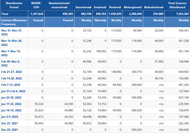 Public Health Emergency: State/Territory-Coordinated Weekly Distribution of COVID-19 Therapeutics