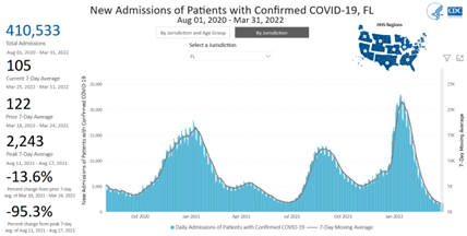 For August 1, 2020–March 31, 2022, Florida has had 410,533 new hospital admissions for Covid patients. This represents 8.9% of all Covid admissions in the US for 6.6% of the US population: