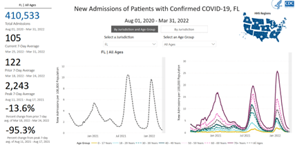 You can find more detailed hospitalization statistics on the same CDC COVID Data Tracker, choosing Florida as the Jurisdiction and stratifying by any age: