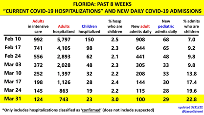 Pediatric hospitalizations are 21% higher than a week ago, with 23 children in Florida hospitals on March 31, 2022.