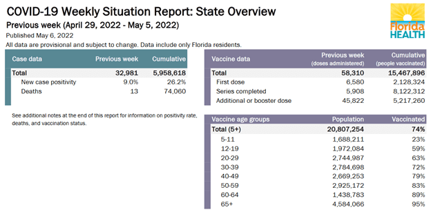 - As of May 5th, Florida claimed a 74% vaccination rate. This includes anyone with at least one shot, over 600,000 snowbirds, and “vaccine tourists.” It excludes children under 5.