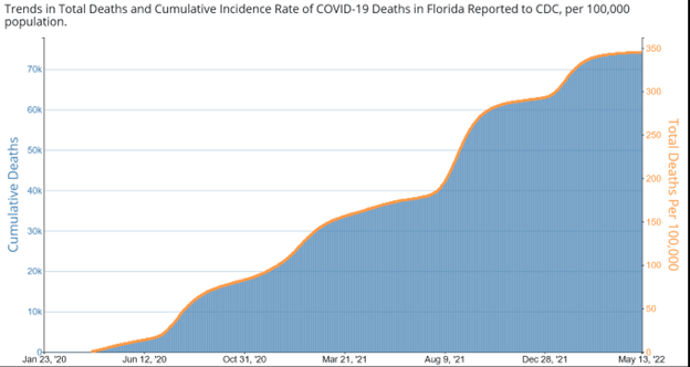 - As of May 12, 2022, FL has had 74,239 Covid deaths among permanent residents.