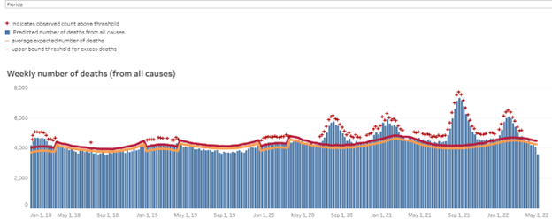 - During June 2021–April 2022, Florida has reported only 7,183 of the 38,834 Covid deaths among permanent residents as “New Deaths” (18%).