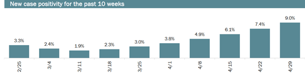 - CDC data using information from the state showed the positivity rate climbed steadily from 12.53% on May 6th to 14.47% on May 11th. That means there were close to 105,000 cases.