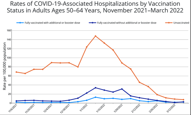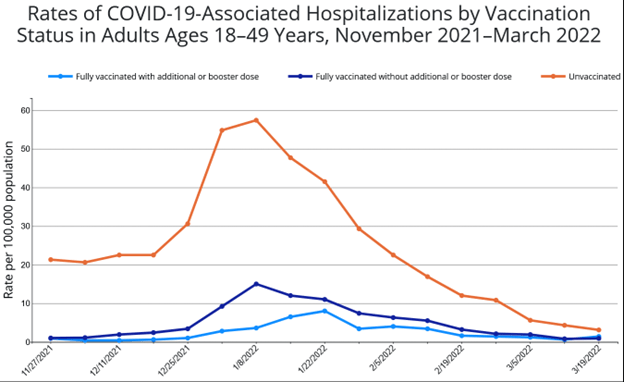 - During March 12–19, 2022, boosters prevented 55% of omicron hospitalizations among people aged 18–49; 72% for ages 50–64; and 87% for senior citizens.