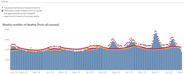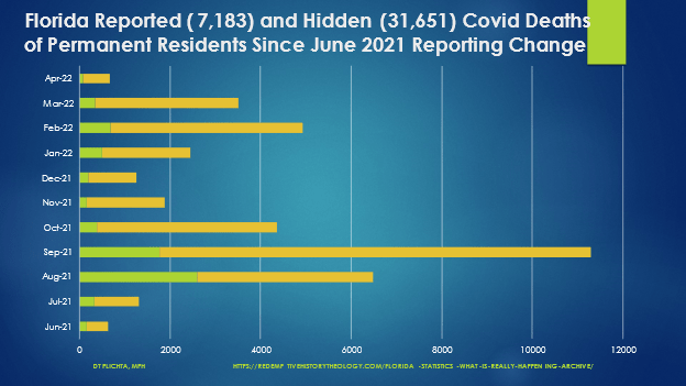 - During June 2021–April 2022, Florida has reported only 7,183 of the 38,834 Covid deaths among permanent residents as “New Deaths” (18%).