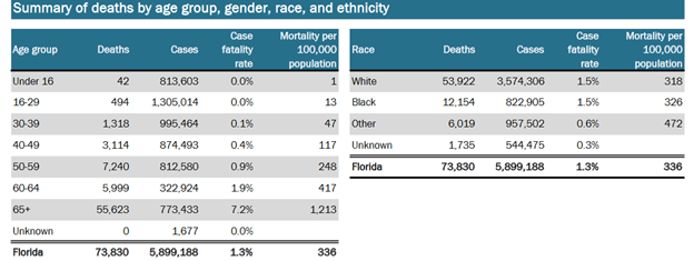 - FL has 9.1% of US deaths when vaccinations were available to all over 15, for 6.6% of the US population.