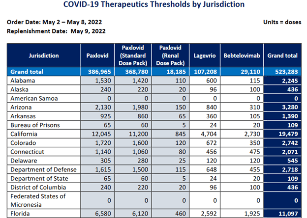 Public Health Emergency: State/Territory-Coordinated Weekly Distribution of COVID-19 Therapeutics