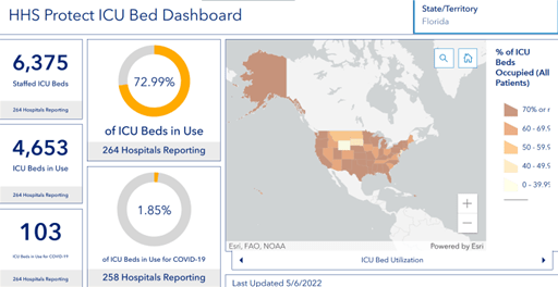 HHS tracks Hospital Utilization. On the morning of May 6, 2022, 76% of hospital beds in Florida were full, down from 77% last week.