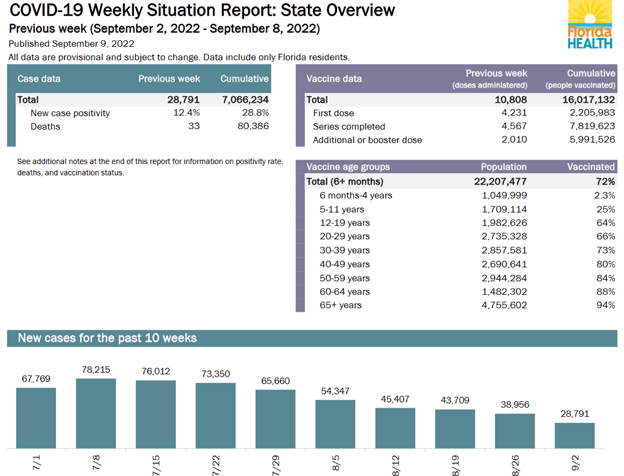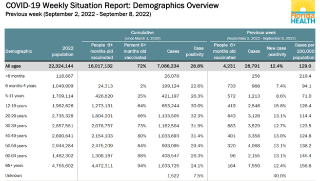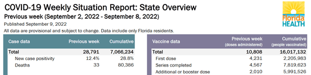 Since I took a one-week break from writing and the Florida Department of Health did not issue an official report, I cannot compare some current statistics to the data from August 26–September 1, 2022.