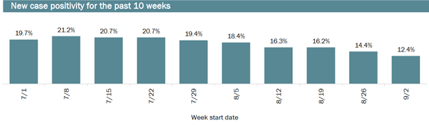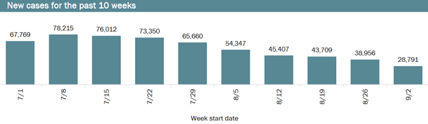 The state seems to be emerging from the latest omicron wave, improving to 29th best for permanent residents. School aged children had 49% fewer confirmed cases and those under 5 had 34% fewer during September 2–8.