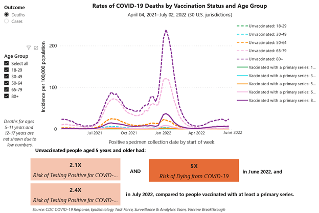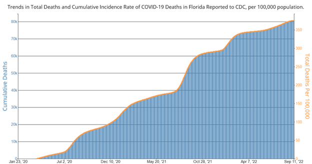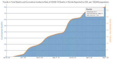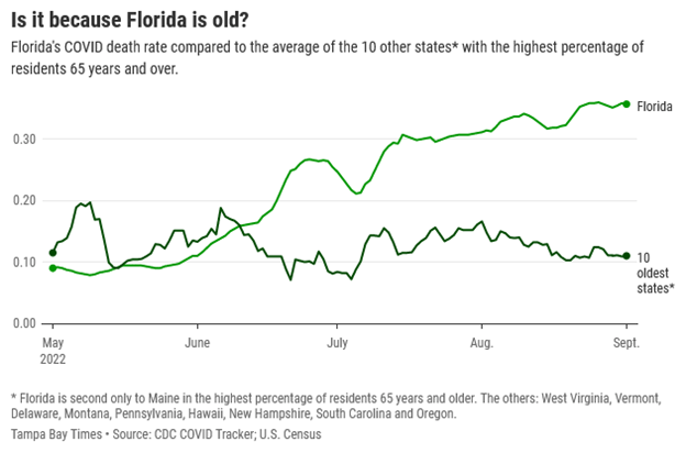 Compared to people in the rest of the US, a permanent Florida resident was 4 times more likely to die due to Covid during September 2–8, 2022. Floridians accounted for 22.3% of all Covid deaths reported that week.
