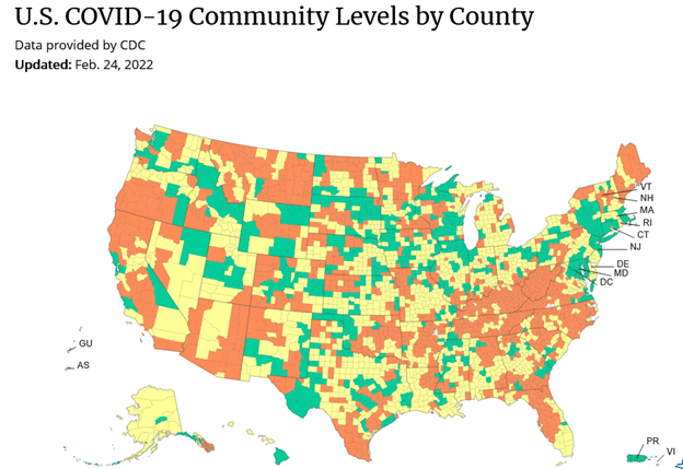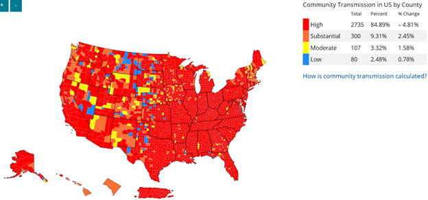 Fifty-nine Florida counties have high transmission; 5 have substantial transmission; 1 has moderate transmission, and 2 have low transmission. This is an improvement from a week earlier, when 64 counties were at the highest level and 3 were deemed substantial: