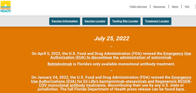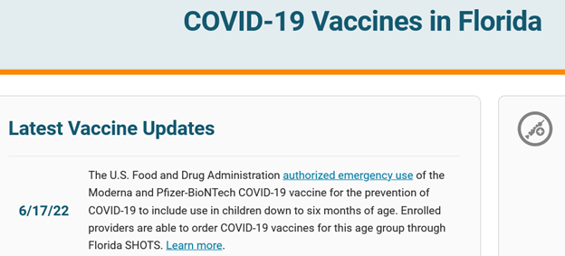 Until receiving a demand from a bipartisan Congressional committee on June 18th, the FL Dept of Health prevented hospitals and doctors’ offices from preordering the vaccines which the FDA and CDC approved for children at least 6 months old. See the Vaccination section for a more detailed account.