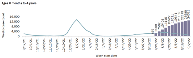 Pediatric Covid hospitalizations are 37% lower on September 8th than a week earlier, with 54 children in the hospital.