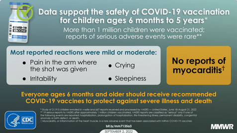 Among 1,040,000 children under 5 who received vaccination, symptoms were like those from routine childhood immunizations. No cases of myocarditis occurred. Only 19 experienced severe reactions. Two of them were hospitalized due to vaccination (0.0002%).
