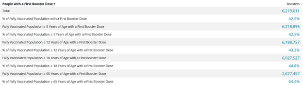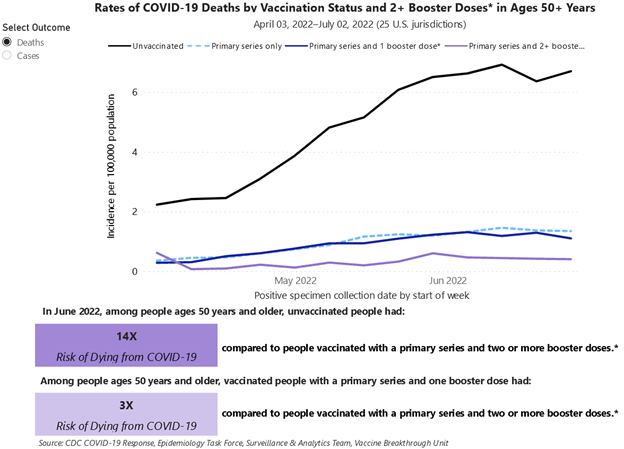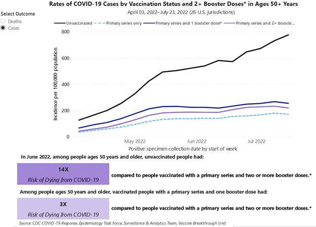 A 2nd booster is much less effective at preventing infections. For people 50+ during July 17–23, having at least 2 boosters prevented 72% of cases; 1 booster prevented 67%; and a primary series prevented 78%.