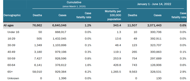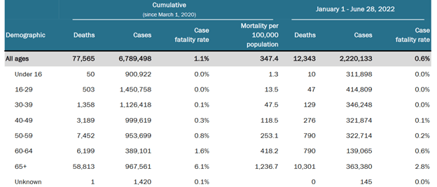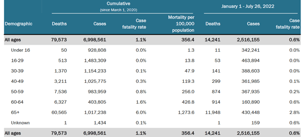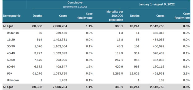 As of 9-8-22, 1.3% of all permanent Florida residents who are 65+ had died from Covid. That this improved after July 14th—when it was also1.3%—is impossible. The dip occurred in the 7-28-22 report even though the size of that demographic group remained the same.