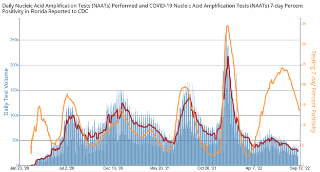 In the region which includes Florida during September 4–10, 2022, the percentage of BA.2 fell to 1%; BA.4 dropped to 2%; BA.4.6 rose to 12%, and BA.5 was almost the same at 85%: