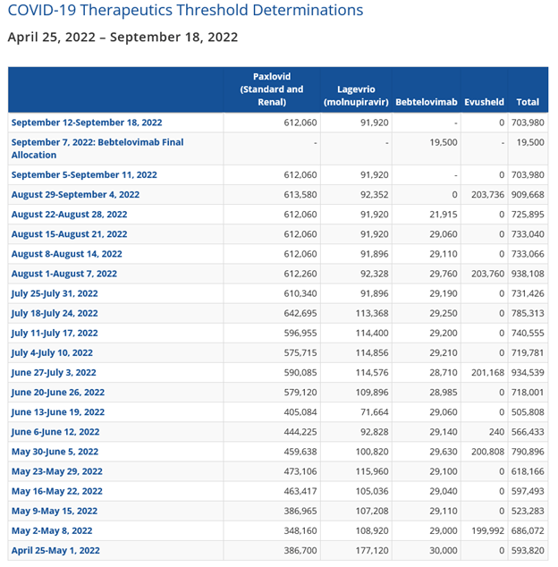 Public Health Emergency: State/Territory-Coordinated Weekly Distribution of COVID-19 Therapeutics