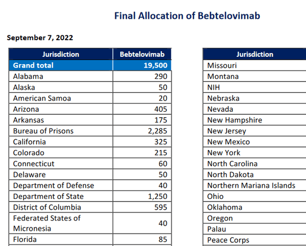 The US delivered a final allocation of 85 doses of bebtelovimab on September 7th: