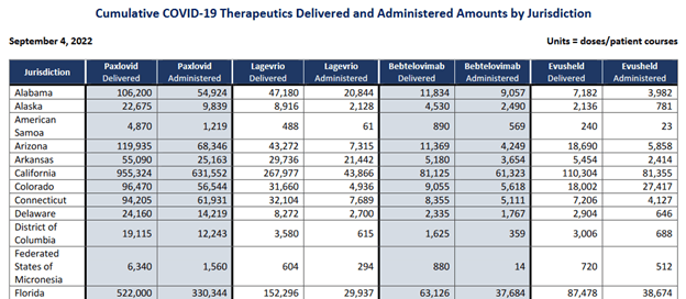 As of September 4th, Florida patients had used 63% of the state’s cumulative Paxlovid deliveries (+5% in 2 weeks); 20% of the Legevrio (Molnupiravir) (+2% in 2 weeks); 60% of the Bebtelovimab (+3% in 2 weeks); and 44% of the Evusheld (+4% in 2 weeks):