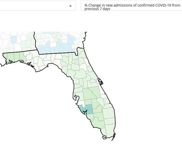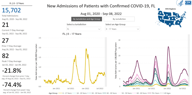 Nevertheless, that was 82% fewer compared to the peak during August 11–17, 2021, when there were 10.42 admissions/100,000 Floridians: