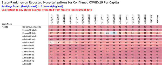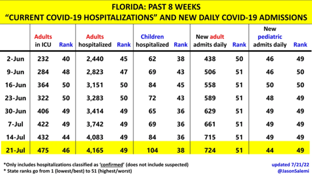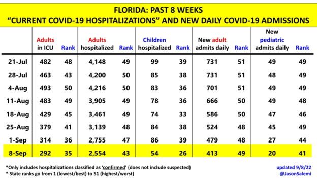 On September 8th, Florida rose from 4th to 3rd worst in the nation for adult Covid admissions. During June 2–August 16, 2022, there were only 4 days that the state did not rank last.