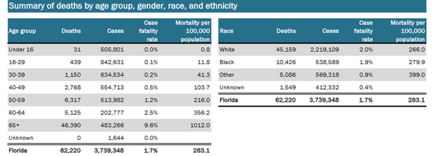 Since the pandemic began, 1.1% of all permanent Florida residents at least 65 years old have died due to Covid-19 (1012/100,000). That is 9.6% of people in that age group who tested positive. Nationwide, 10.0% of senior citizens who have tested positive have died: