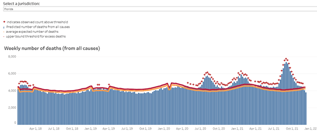 The CDC recently updated their algorithm for calculating excess deaths in the US to include six years of data, rather than four, due to the pandemic skewing the expected numbers. Here is that information for Florida. You can click on each bar on their site to see the data for that week. It takes up to eight weeks for complete reporting: