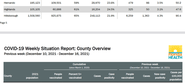 This data from December 3–9, 2021, came from Dr. Salemi’s archives. Since October 14th, my browser will not download the FL Dept of Health Weekly Report, citing it as a security risk. Nevertheless, you would not find any archived Covid information on the FL Dept of Health site: