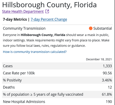 During December 11–17, 2021, Hillsborough County had 12 deaths reported to the CDC. Last week, we had 3, an increase of 300%: