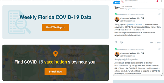 Since October 14, 2021, I have made many attempts to access the FL Dept of Health Weekly Report. However, my browser will not download it due to a potential security risk: