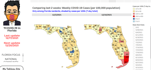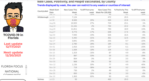 Dr. Jason Salemi, a professor from the University of South Florida, has been compiling data from the state since May 28th. His county-level data are quite helpful. Note that this runs one week late. It indicates that Hillsborough County rose from 56 cases per 100,000 people to 90 during December 3rd–10th. On his site, you can click on the maps for detailed information on each county: