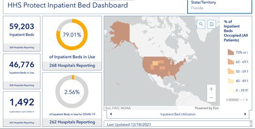 HHS tracks Hospital Utilization. On December 18, 2021, 79% of hospital beds in Florida were full, down 1% from last week. Covid patients accounted for 3% of utilized beds. Last week, there were 1,393 hospitalized Covid patients, making this an increase of 7%. Six weeks ago, hospitalizations dropped 35%.