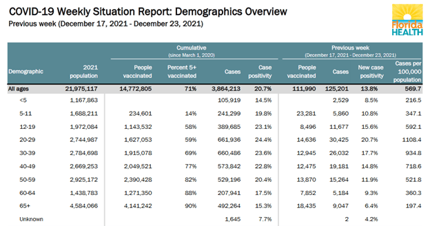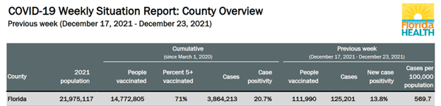 This data from December 10–16, 2021, came from Dr. Salemi’s archives. Since October 14th, my browser will not download the FL Dept of Health Weekly Report, citing it as a security risk. Nevertheless, you would not find any archived Covid information on the FL Dept of Health site: