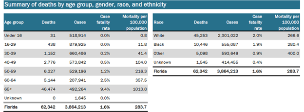 Since the pandemic began, 1.1% of all permanent Florida residents at least 65 years old have died due to Covid-19 (1014/100,000). That is 9.4% of people in that age group who tested positive. Nationwide, 9.9% of senior citizens who have tested positive have died: