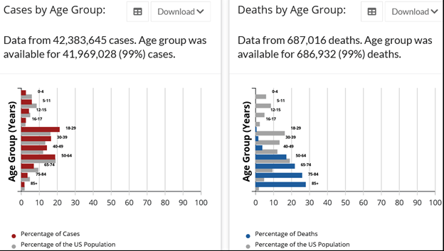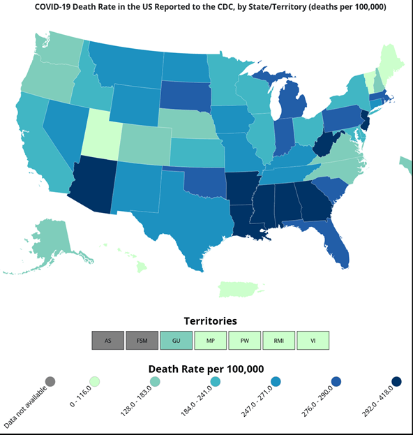 This week, Florida has improved from the deepest shade of blue for the first time since I began downloading this graphic. We still have the highest proportion of Covid deaths among the six largest states: CA (190); TX (255); FL (290); NY (209); PA (279); IL (240). Florida has the ninth worst death rate in the nation: